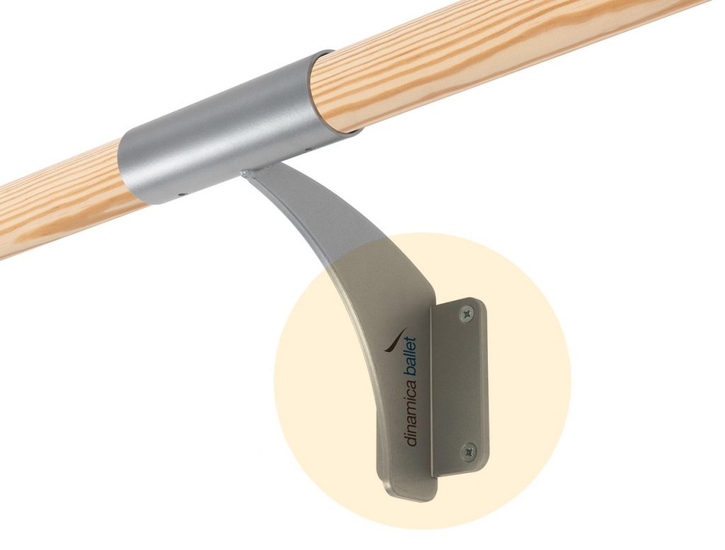 La base de acero de unión a la pared tiene la dimensión calculada para garantizar total estabilidad. La forma cilíndrica que abraza la barra de madera crea una dispersión de la presión que ejercen las bailarinas.
